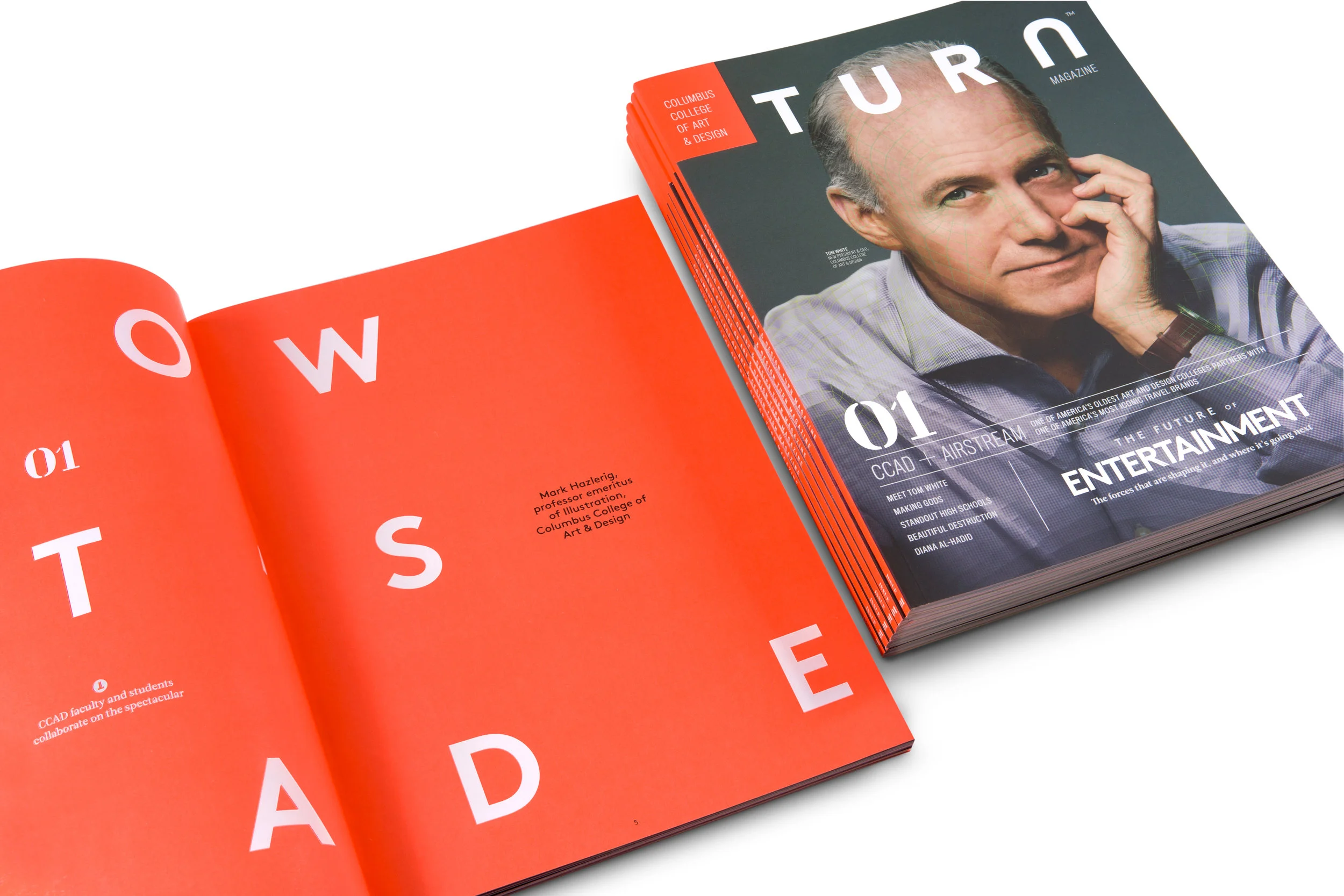 TURN is Columbus College of Art and Design’s new alumni magazine. The idea was to create a fresh publication that alumni, current students and members of the community would want to pick up and read. The concept of the first issue was based on the idea of process, which each article speaks to. As a team, we created a branding system for the magazine to pair well with CCAD’s master brand. Full of creativity and no ads allowed, TURN was a sincere collaboration between CCAD and our team at Ologie.
